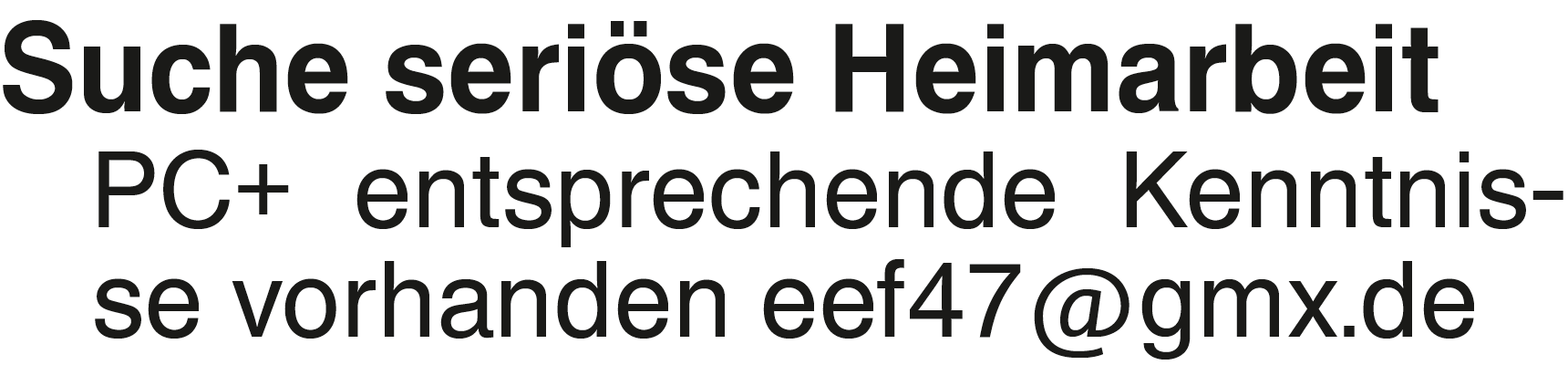 Suche seriöse Heimarbeit PC+ entsprechende Kenntnisse vorhanden eef47@gmx.deKontakt