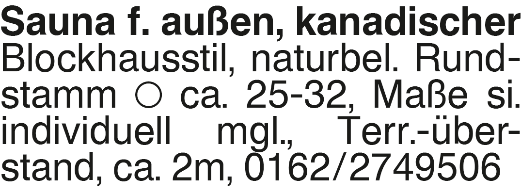 Sauna f. außen, kanadisch Sauna f. außen, kanadischer Blockhausstil, naturbel. Rundstamm ca. 25-32, Maße si. individuell mgl., Terr.-überstand, ca. 2m, 0162/2749506Kontakt