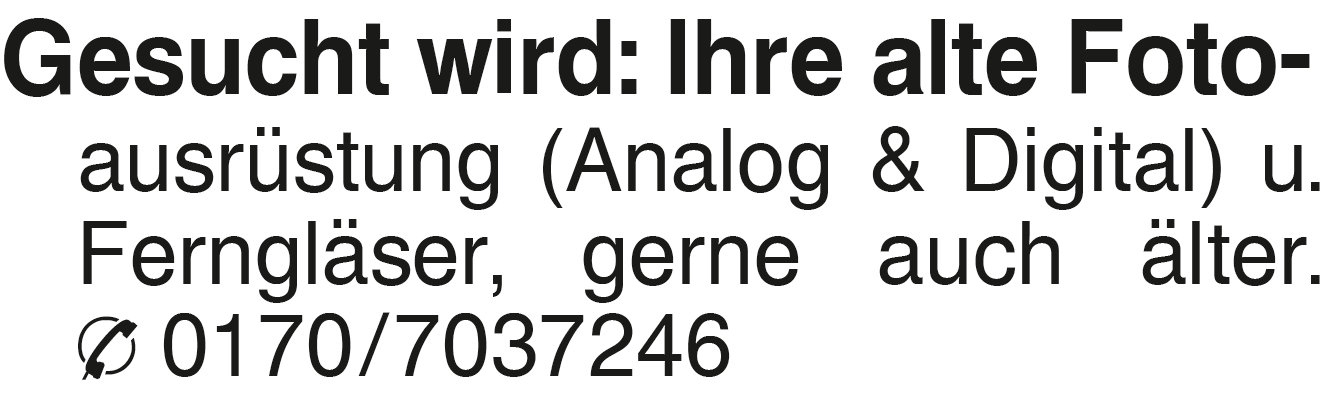 Gesucht wird: Ihre alte F Gesucht wird: Ihre alte Foto- ausrüstung (Analog & Digital) u. Ferngläser, gerne auch älter. 0170/7037246Das könnte Sie auch interessieren