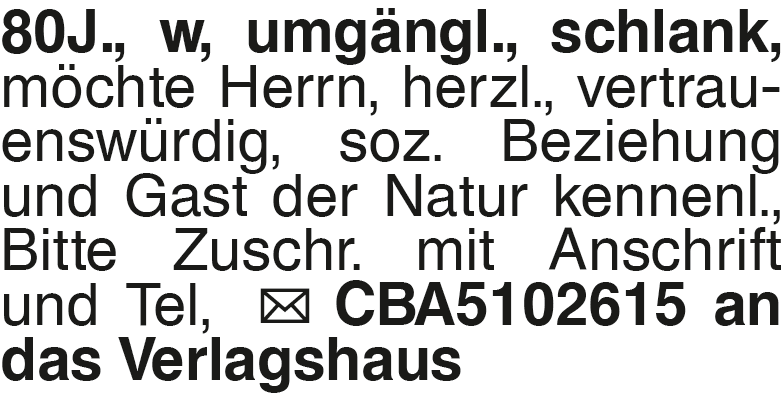 80J., w, umgängl., schlan 80J., w, umgängl., schlank, möchte Herrn, herzl., vertrauenswürdig, soz. Beziehung und Gast der Natur kennenl., Bitte Zuschr. mit Anschrift und Tel, CBA5102615 an das VerlagshausDas könnte Sie auch interessieren