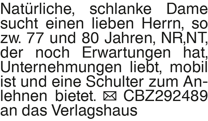 Natürliche, schlanke Dame Natürliche, schlanke Dame sucht einen lieben Herrn, so zw. 77 und 80 Jahren, NR,NT, der noch Erwartungen hat, Unternehmungen liebt, mobil ist und eine Schulter zum Anlehnen bietet.Das könnte Sie auch interessieren