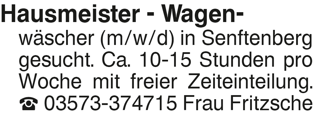 Hausmeister - Wagenwäscher Hausmeister - Wagen- wäscher (m/w/d) in Senftenberg gesucht. Ca. 10-15 Stunden pro Woche mit freier Zeiteinteilung. 03573-374715 Frau FritzscheDas könnte Sie auch interessieren