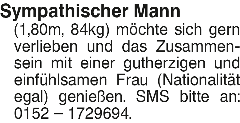 Sympathischer Mann (1,80m Sympathischer Mann (1,80m, 84kg) möchte sich gern verlieben und das Zusammensein mit einer gutherzigen und einfühlsamen Frau (Nationalität egal) genießen. SMS bitte an: 0152 # 1729694.Das könnte Sie auch interessieren