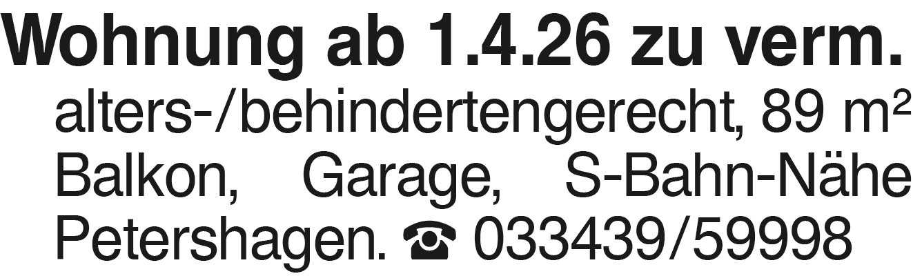 Wohnung ab 1.4.26 zu verm Wohnung ab 1.4.26 zu verm. alters-/behindertengerecht, 89 m2 Balkon, Garage, S-Bahn-Nähe Petershagen. 033439/59998Das könnte Sie auch interessieren