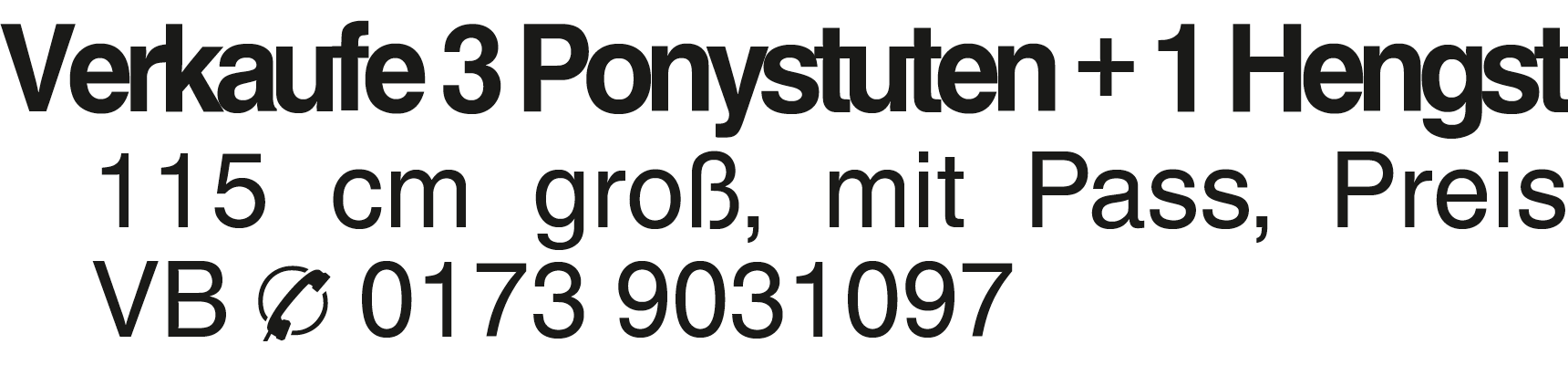 Verkaufe 3 Ponystuten + 1 Verkaufe 3 Ponystuten + 1 Hengst 115 cm groß, mit Pass, Preis VB 0173 9031097Kontakt