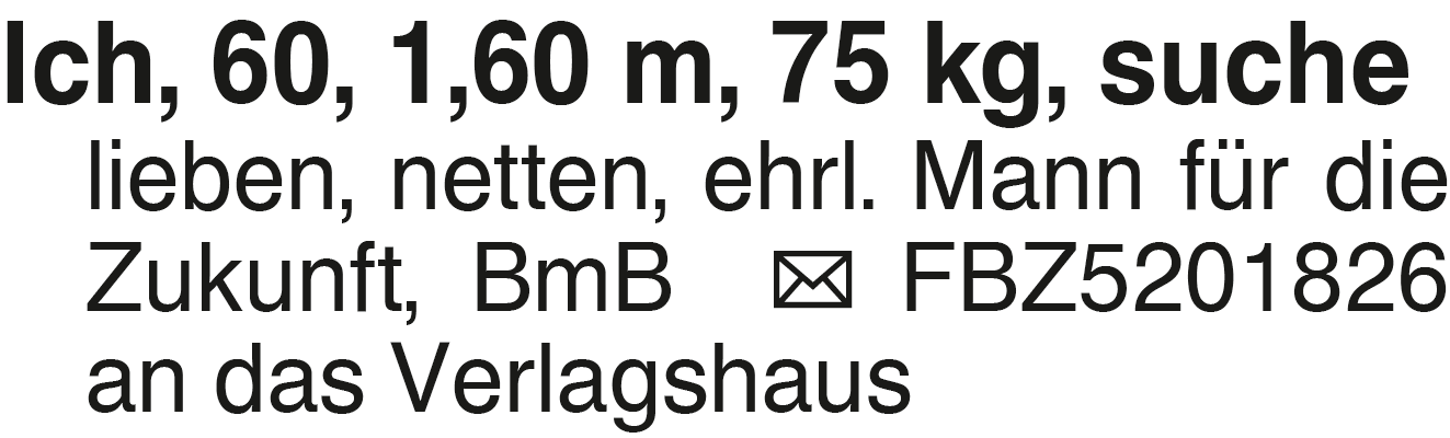 Ich 60 1,60 m 75 kg suche Ich, 60, 1,60 m, 75 kg, suche lieben, netten, ehrl. Mann für die Zukunft, BmB FBZ5201826 an das VerlagshausDas könnte Sie auch interessieren