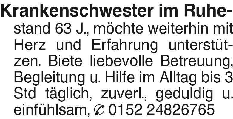 Krankenschwester im Ruhe- Krankenschwester im Ruhe- stand 63 J., möchte weiterhin mit Herz und Erfahrung unterstützen. Biete liebevolle Betreuung, Begleitung u. Hilfe im Alltag bis 3 Std täglich, zuverl., geduldig u. einfühlsam, 0152 24826765