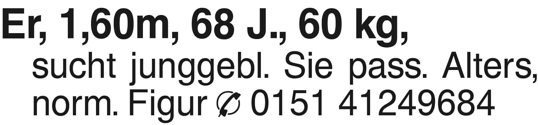 Fisch, 1,60m, 68 J., Rauc Er, 1,60m, 68 J., 60 kg, sucht junggebl. Sie pass. Alters, norm. Figur 0151 41249684Das könnte Sie auch interessieren