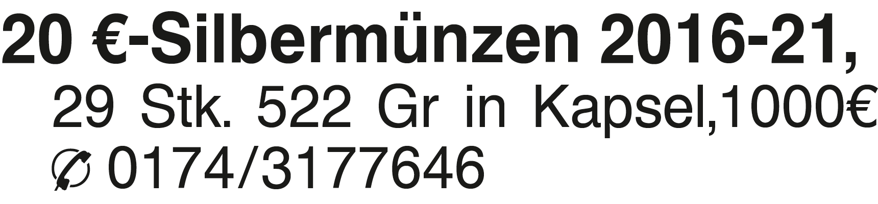 20 EUR-Silbermünzen 2016- 20 EUR-Silbermünzen 2016-21, 29 Stk. 522 Gr in Kapsel,1000 EUR 0174/3177646Das könnte Sie auch interessieren