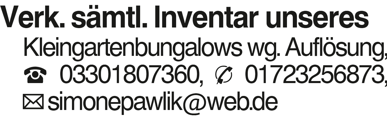 Verk. sämtl. Inventar uns Verk. sämtl. Inventar unseres Kleingartenbungalows wg. Auflösung, 03301807360, 01723256873, simonepawlik@web.de