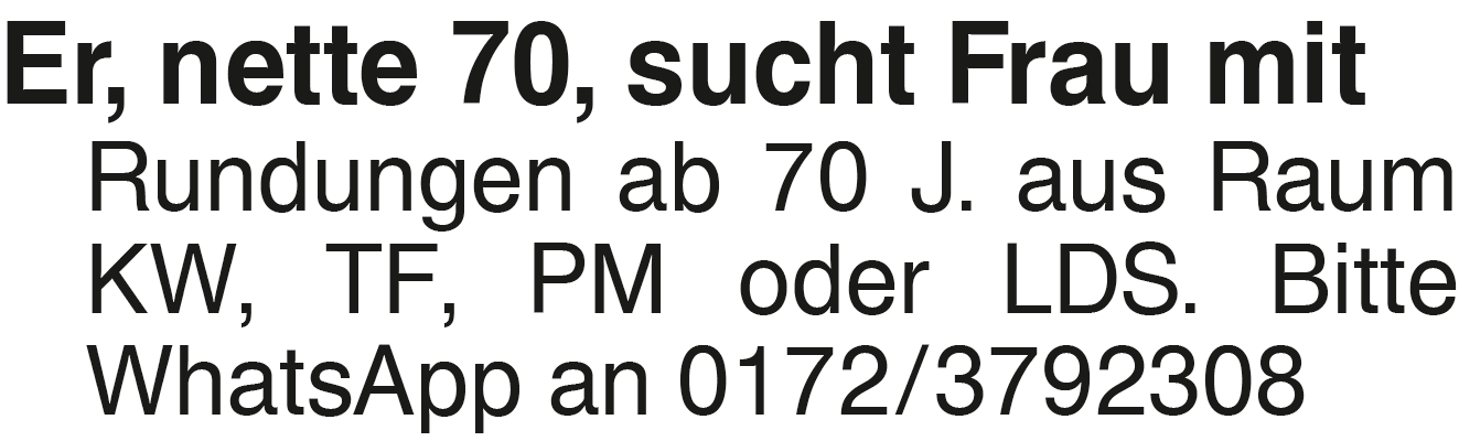 Er, nette 70, sucht Frau Er, nette 70, sucht Frau mit Rundungen ab 70 J. aus Raum KW, TF, PM oder LDS. Bitte WhatsApp an 0172/3792308Das könnte Sie auch interessieren