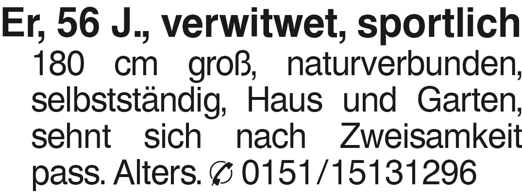 Er, 56 J., verwitwet, spo Er, 56 J., verwitwet, sportlich 180 cm groß, naturverbunden, selbstständig, Haus und Garten, sehnt sich nach Zweisamkeit pass. Alters. 0151/15131296Das könnte Sie auch interessieren