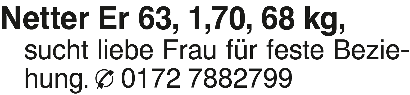 Netter Er 63, 1,70, 68 kg Netter Er 63, 1,70, 68 kg, sucht liebe Frau für feste Beziehung. 0172 7882799Das könnte Sie auch interessieren