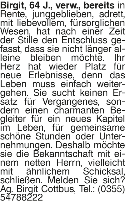 Birgit, 64 Jahre Birgit, 64 J., verw., bereits in Rente, junggeblieben, adrett, mit liebevollem, fürsorglichen Wesen, hat nach einer Zeit der Stille den Entschluss gefasst, dass sie nicht länger alleine bleiben möchte. Ihr Herz hat wieder Platz für neue Erlebnisse, denn das Leben muss einfach weitergehen. Sie sucht keinen Ersatz für Vergangenes, sondern einen charmanten Begleiter für ein neues Kapitel im Leben, für gemeinsame schöne Stunden oder Unternehmungen. Deshalb möchte sie die Bekanntschaft mit einem netten Herrn, vielleicht mit ähnlichem Schicksal, schließen. Melden Sie sich? Ag. Birgit Cottbus, Tel.: (0355) 54788222Das könnte Sie auch interessieren