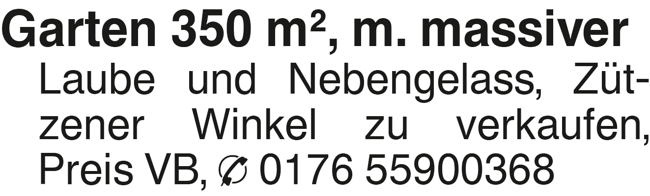 Garten 350 m2, m. mass. L Garten 350 m2, m. massiver Laube und Nebengelass, Zützener Winkel zu verkaufen, Preis VB, 0176 55900368Das könnte Sie auch interessieren