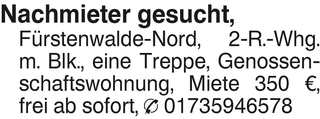 Nachmieter gesucht, Fürst Nachmieter gesucht, Fürstenwalde-Nord, 2-R.-Whg. m. Blk., eine Treppe, Genossenschaftswohnung, Miete 350 EUR, frei ab sofort, 01735946578Kontakt