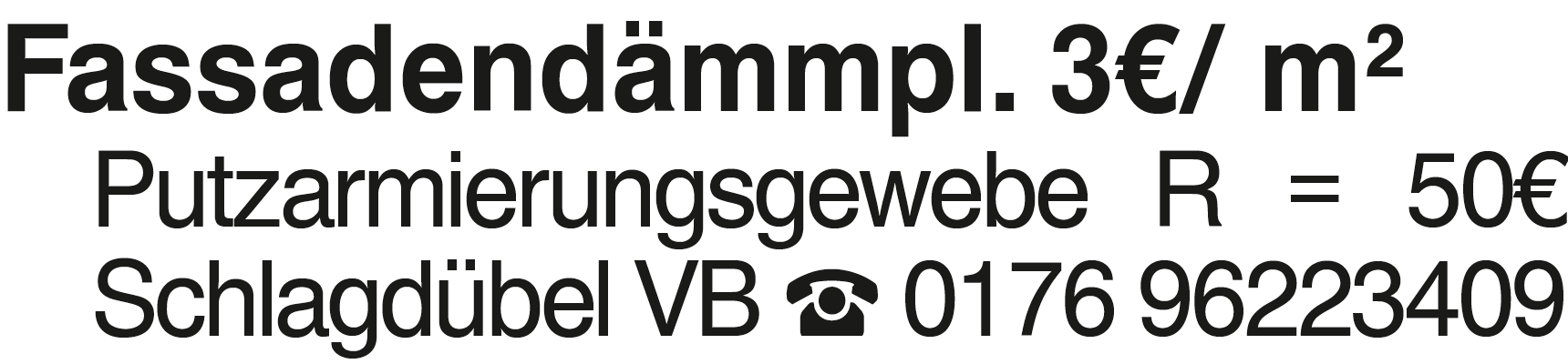 Fassadendämmpl. 3 EUR/ m2 Fassadendämmpl. 3 EUR/ m2 Putzarmierungsgewebe R = 50 EUR Schlagdübel VB 0176 96223409Das könnte Sie auch interessieren