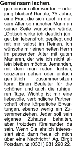 Erscheinungsdatum: Anzeige vom 18.4.2026 in der Rubrik "Ehe-/ Partnervermittlungen"
