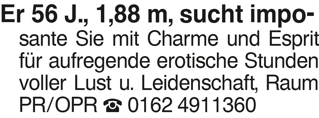 Er 56 J., 1,88 m, sucht i Er 56 J., 1,88 m, sucht impo- sante Sie mit Charme und Esprit für aufregende erotische Stunden voller Lust u. Leidenschaft, Raum PR/OPR 0162 4911360Das könnte Sie auch interessieren