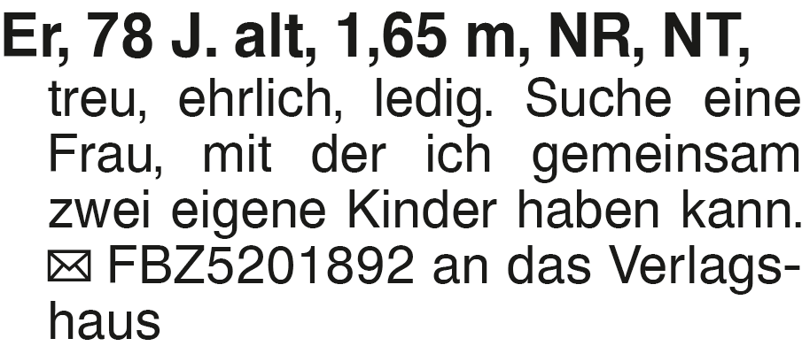Er, 78 J. alt, 1,65 m, NR Er, 78 J. alt, 1,65 m, NR, NT, treu, ehrlich, ledig. Suche eine Frau, mit der ich gemeinsam zwei eigene Kinder haben kann. FBZ5201892 an das VerlagshausDas könnte Sie auch interessieren