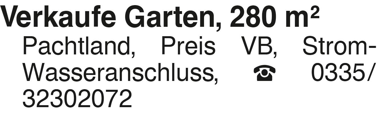 Verkaufe Garten, 280 m2 P Verkaufe Garten, 280 m2 Pachtland, Preis VB, Strom-Wasseranschluss, 0335/32302072Kontakt