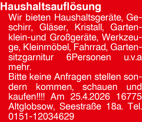 Haushaltsauflösung Wir bi Wir bieten Haushaltsgeräte, Geschirr, Gläser, Kristall, Gartenklein-und Großgeräte, Werkzeuge, Kleinmöbel, Fahrrad, Gartensitzgarnitur 6Personen u.v.a mehr. Bitte keine Anfragen stellen sondern kommen, schauen und kaufen!!!! Am 25.4.2026 16775 Altglobsow, Seestraße 18a. Tel. 0151-12034629Das könnte Sie auch interessieren