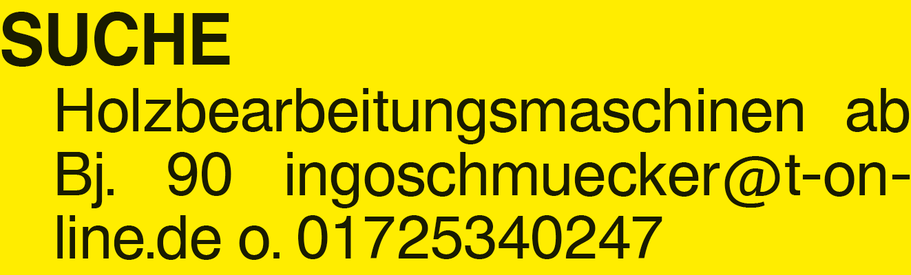 SUCHE Holzbearbeitungsmas Holzbearbeitungsmaschinen ab Bj. 90 ingoschmuecker@t-online.de o. 01725340247 ingoschmuecker@t-online.deDas könnte Sie auch interessieren