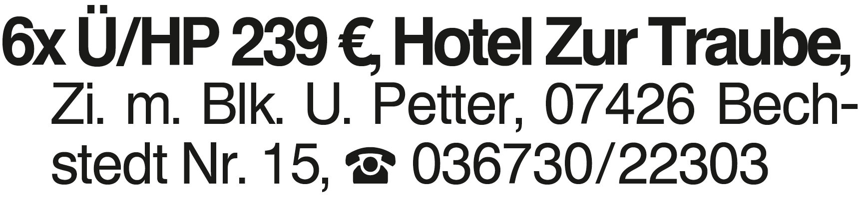 6x Ü/HP 239 EUR, Hotel Zu 6x Ü/HP 239 EUR, Hotel Zur Traube, Zi. m. Blk. U. Petter, 07426 Bech-stedt Nr. 15, 036730/22303Kontakt