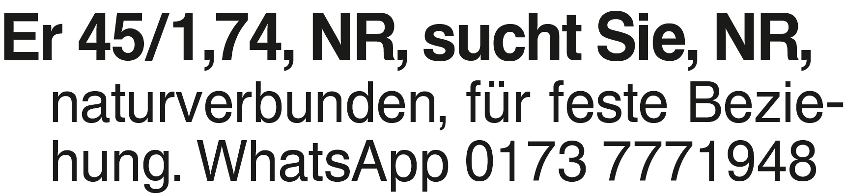 Er 45/1,74,NR,sucht Sie,N Er 45/1,74, NR, sucht Sie, NR, naturverbunden, für feste Beziehung. WhatsApp 0173 7771948