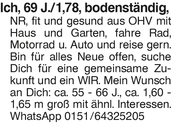 Ich, 69/1,78 J., bodenstä Ich, 69 J./1,78, bodenständig, NR, fit und gesund aus OHV mit Haus und Garten, fahre Rad, Motorrad u. Auto und reise gern. Bin für alles Neue offen, suche Dich für eine gemeinsame Zukunft und ein WIR. Mein Wunsch an Dich: ca. 55 - 66 J., ca. 1,60 - 1,65 m groß mit ähnl. Interessen. WhatsApp 0151/64325205Das könnte Sie auch interessieren