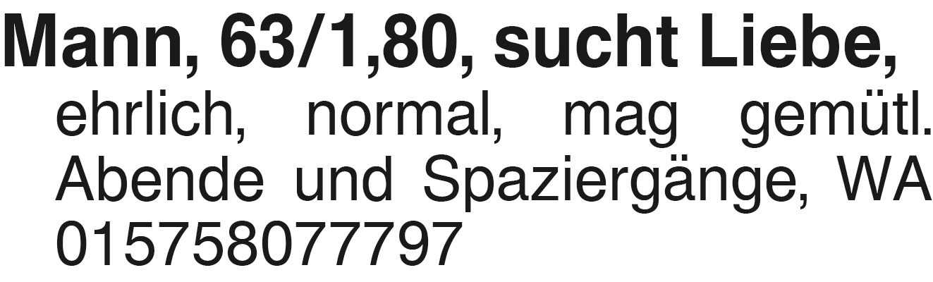 Mann, 63/1,80, sucht lieb Mann, 63/1,80, sucht Liebe, ehrlich, normal, mag gemütl. Abende und Spaziergänge, WA 015758077797Das könnte Sie auch interessieren