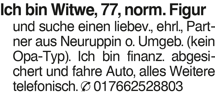 Ich bin Witwe, 77, norm. Ich bin Witwe, 77, norm. Figur und suche einen liebev., ehrl., Partner aus Neuruppin o. Umgeb. (kein Opa-Typ). Ich bin finanz. abgesichert und fahre Auto, alles Weitere telefonisch. 017662528803Das könnte Sie auch interessieren