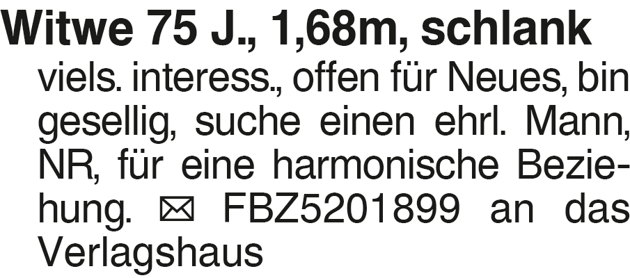 Witwe 75 J., 1,68m, schla Witwe 75 J., 1,68m, schlank viels. interess., offen für Neues, bin gesellig, suche einen ehrl. Mann, NR, für eine harmonische Beziehung. FBZ5201899 an das Verlagshaus