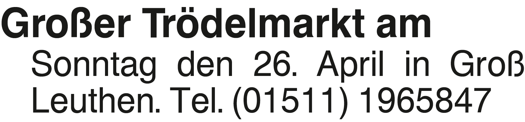 Großer Trödelmarkt am Son Sonntag den 26. April in Groß Leuthen. Tel. (01511) 1965847Das könnte Sie auch interessieren