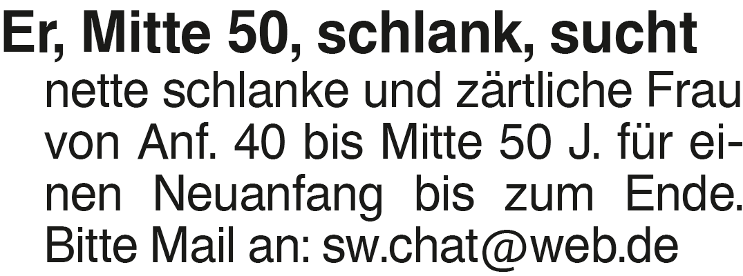 Er, Mitte 50, schlank, su Er, Mitte 50, schlank, sucht nette schlanke und zärtliche Frau von Anf. 40 bis Mitte 50 J. für einen Neuanfang bis zum Ende. Bitte Mail an: sw.chat@web.deDas könnte Sie auch interessieren