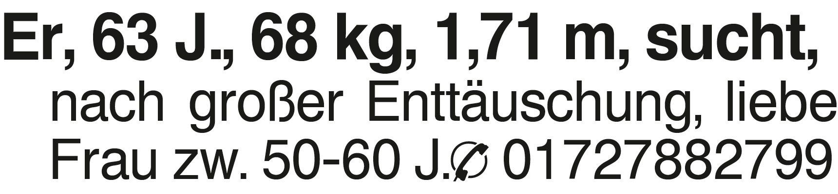 Er, 63 J., 68 kg, 1,71 m, Er, 63 J., 68 kg, 1,71 m, sucht, nach großer Enttäuschung, liebe Frau zw. 50-60 J. 01727882799Das könnte Sie auch interessieren