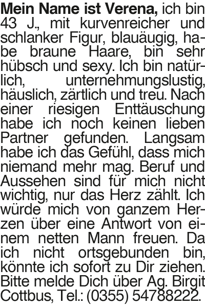 Verena Mein Name ist Verena, ich bin 43 J., mit kurvenreicher und schlanker Figur, blauäugig, habe braune Haare, bin sehr hübsch und sexy. Ich bin natürlich, unternehmungslustig, häuslich, zärtlich und treu. Nach einer riesigen Enttäuschung habe ich noch keinen lieben Partner gefunden. Langsam habe ich das Gefühl, dass mich niemand mehr mag. Beruf und Aussehen sind für mich nicht wichtig, nur das Herz zählt. Ich würde mich von ganzem Herzen über eine Antwort von einem netten Mann freuen. Da ich nicht ortsgebunden bin, könnte ich sofort zu Dir ziehen. Bitte melde Dich über Ag. Birgit Cottbus, Tel.: (0355) 54788222.Das könnte Sie auch interessieren