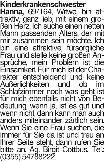Hanna Kinderkrankenschwester Hanna, 69/164, Witwe, bin attraktiv, ganz lieb, mit einem großen Herz. Ich suche einen netten Mann passenden Alters, der mit mir zusammen sein möchte. Ich bin eine attraktive, fürsorgliche Frau und stelle keine großen Ansprüche, mein Problem ist die Einsamkeit. Für mich ist der Charakter entscheidend und keine Äußerlichkeiten und ob im Schlafzimmer noch was geht ist für mich ebenfalls nicht von Bedeutung, wenn ja, ist es gut und wenn nicht, dann kann man auch anders miteinander zärtlich sein. Wenn Sie eine Frau suchen, die immer für Sie da ist und treu an Ihrer Seite steht, dann rufen Sie bitte an. Ag. Birgit Cottbus, Tel.: (0355) 54788222.Das könnte Sie auch interessieren