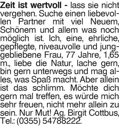 Junggebliebene Frau Zeit ist wertvoll - lass sie nicht vergehen. Suche einen liebevollen Partner mit viel Neuem, Schönem und allem was noch möglich ist. Ich, eine, ehrliche, gepflegte, niveauvolle und junggebliebene Frau, 77 Jahre, 1,65 m., liebe die Natur, lache gern, bin gern unterwegs und mag alles, was Spaß macht. Aber allein ist das schlimm. Möchte dich gern mal treffen, es würde mich sehr freuen, nicht mehr allein zu sein. Nur Mut! Ag. Birgit Cottbus, Tel.: (0355) 54788222.Das könnte Sie auch interessieren