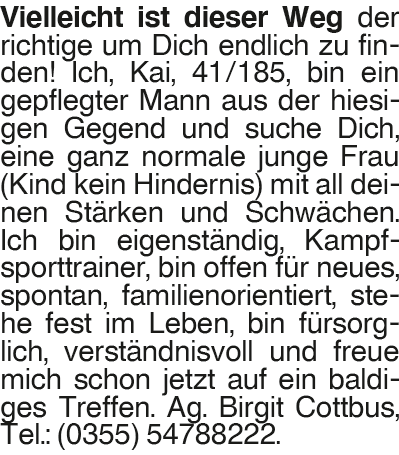 Kai Vielleicht ist dieser Weg der richtige um Dich endlich zu finden! Ich, Kai, 41/185, bin ein gepflegter Mann aus der hiesigen Gegend und suche Dich, eine ganz normale junge Frau (Kind kein Hindernis) mit all deinen Stärken und Schwächen. Ich bin eigenständig, Kampfsporttrainer, bin offen für neues, spontan, familienorientiert, stehe fest im Leben, bin fürsorglich, verständnisvoll und freue mich schon jetzt auf ein baldiges Treffen. Ag. Birgit Cottbus, Tel.: (0355) 54788222.Das könnte Sie auch interessieren