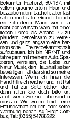 Bekannter Facharzt Bekannter Facharzt, 69/187, mit vollem graumeliertem Haar und bezauberndem Lächeln, aber fast schon mutlos. Im Grunde bin ich ein zufriedener Mann, wenn da nicht der Wunsch wäre mit einer lieben Dame bis Anfang 70 zu plaudern, gemeinsam zu verreisen und ganz langsam eine harmonische Freizeitbekanntschaft aufzubauen. Ich bin NR/NT und fahre gern mit meinem Auto. Spazieren, verreisen, die Liebe zur Natur, Musik, den Haushalt selber bewältigen - all das sind so meine Interessen. Wenn ich Ihnen die Hand hilfreich reichen und mit Rat und Tat zur Seite stehen darf, dann rufen Sie doch bitte an, auch wenn Sie sich überwinden müssen. Wir wollen beide eine Freundschaft bei der jeder seine Wohnung behält. Ag. Birgit Cottbus, Tel.: (0355) 54788222.Das könnte Sie auch interessieren