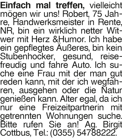 Robert Einfach mal treffen, vielleicht mögen wir uns! Robert, 75 Jahre, Handwerksmeister in Rente, NR, bin ein wirklich netter Witwer mit Herz &Humor. Ich habe ein gepflegtes Äußeres, bin kein Stubenhocker, gesund, reisefreudig und fahre Auto. Ich suche eine Frau mit der man gut reden kann, mit der ich wegfahren, ausgehen oder die Natur genießen kann. Alter egal, da ich nur eine Freizeitpartnerin mit getrennten Wohnungen suche. Bitte rufen Sie an! Ag. Birgit Cottbus, Tel.: (0355) 54788222.Das könnte Sie auch interessieren
