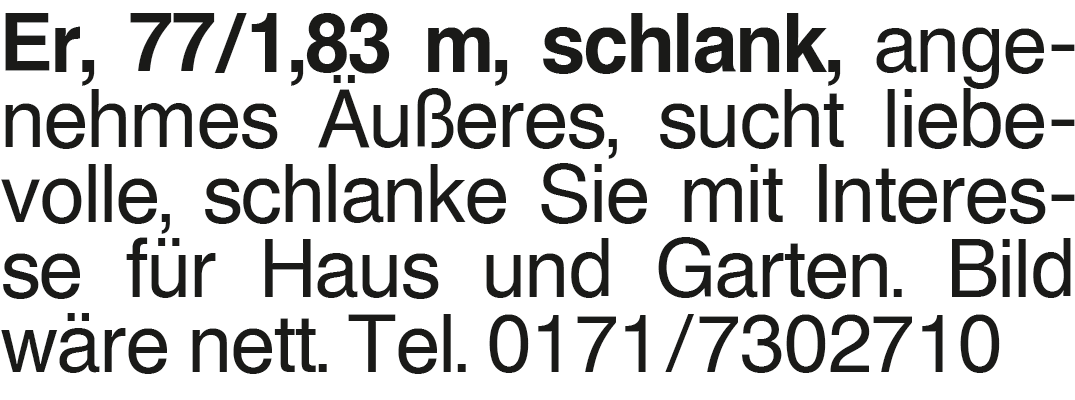 Er, 77/1,83 m, schlank, a Er, 77/1,83 m, schlank, angenehmes Äußeres, sucht liebevolle, schlanke Sie mit Interesse für Haus und Garten. Bild wäre nett. Tel. 0171/7302710Das könnte Sie auch interessieren