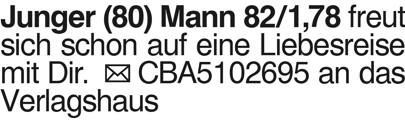Junger (80) Mann 82/1,78 Junger (80) Mann 82/1,78 freut sich schon auf eine Liebesreise mit Dir. CBA5102695 an das VerlagshausDas könnte Sie auch interessieren