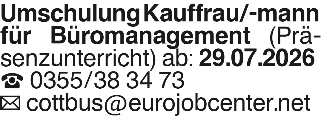 Umschulung Kauffrau/-mann Büro... Umschulung Kauffrau/-mann für Büromanagement (Präsenzunterricht) ab: 29.07.2026 0355/38 34 73 cottbus@eurojobcenter.netKontakt