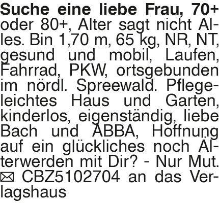 Suche eine liebe Frau, 70 Suche eine liebe Frau, 70+ oder 80+, Alter sagt nicht Alles. Bin 1,70 m, 65 kg, NR, NT, gesund und mobil, Laufen, Fahrrad, PKW, ortsgebunden im nördl. Spreewald. Pflegeleichtes Haus und Garten, kinderlos, eigenständig, liebe Bach und ABBA, Hoffnung auf ein glückliches noch Älterwerden mit Dir? - Nur Mut. CBZ5102704 an das VerlagshausDas könnte Sie auch interessieren