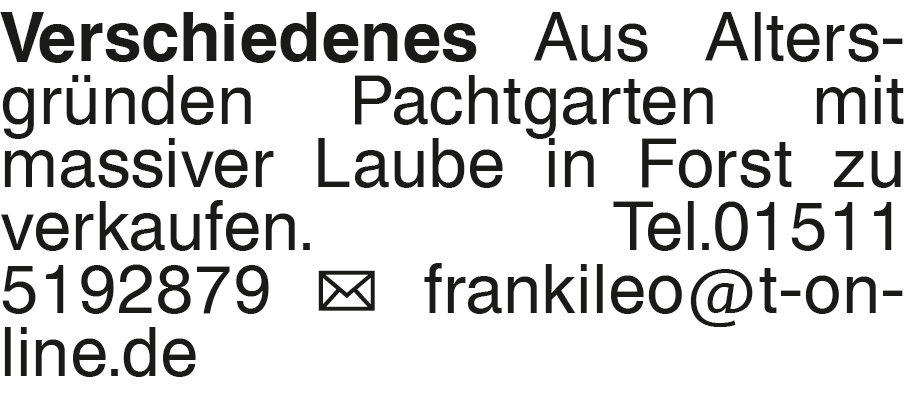 Verschiedenes Aus Altersg Aus Altersgründen Pachtgarten mit massiver Laube in Forst zu verkaufen. Tel.01511 5192879 frankileo@t-online.deDas könnte Sie auch interessieren