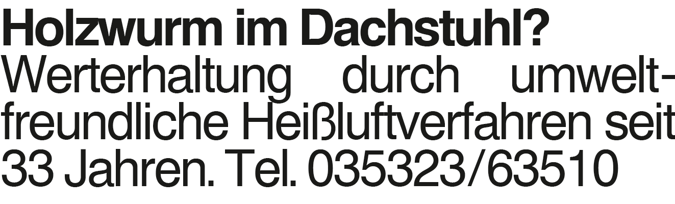 Holzwurm im Dachstuhl? We Holzwurm im Dachstuhl? Werterhaltung durch umweltfreundliche Heißluftverfahren seit 33 Jahren. Tel. 035323/63510Das könnte Sie auch interessieren