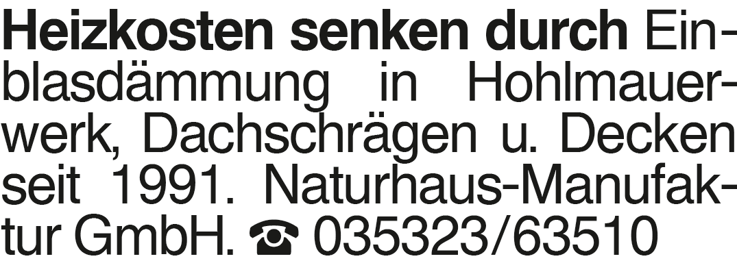 Heizkosten senken durch E Heizkosten senken durch Einblasdämmung in Hohlmauerwerk, Dachschrägen u. Decken seit 1991. Naturhaus-Manufaktur GmbH. 035323/63510Das könnte Sie auch interessieren