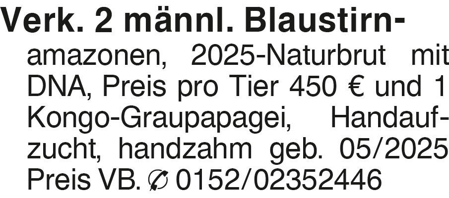 Verk. 2 männl. Blaustirn- Verk. 2 männl. Blaustirn- amazonen, 2025-Naturbrut mit DNA, Preis pro Tier 450 EUR und 1 Kongo-Graupapagei, Handaufzucht, handzahm geb. 05/2025 Preis VB. 0152/02352446Das könnte Sie auch interessieren